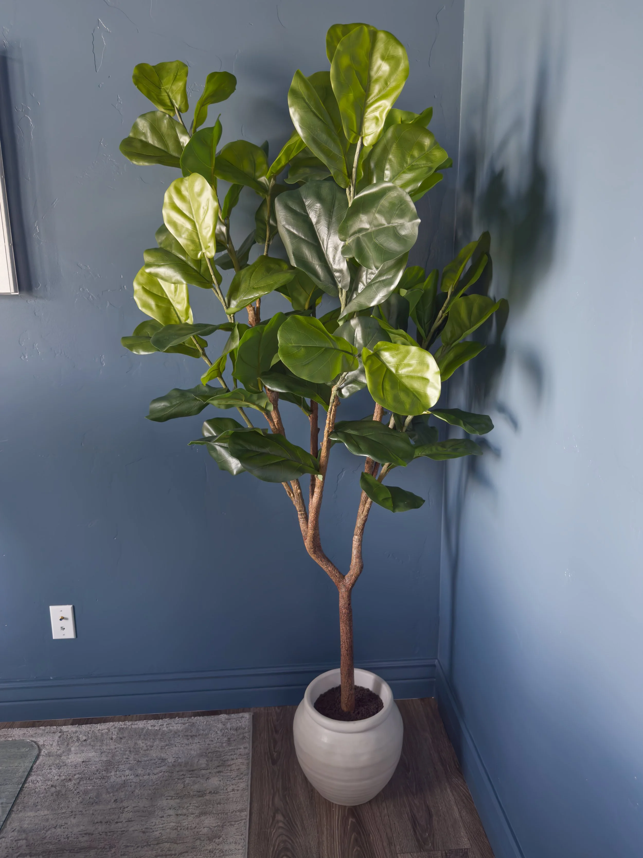 From there, the styling was kept minimal—just enough to add interest without reintroducing visual noise. A modern lamp, a faux fiddle leaf fig, and a single piece of artwork bring in a mix of clean lines and organic softness that aligns with the rest of the home