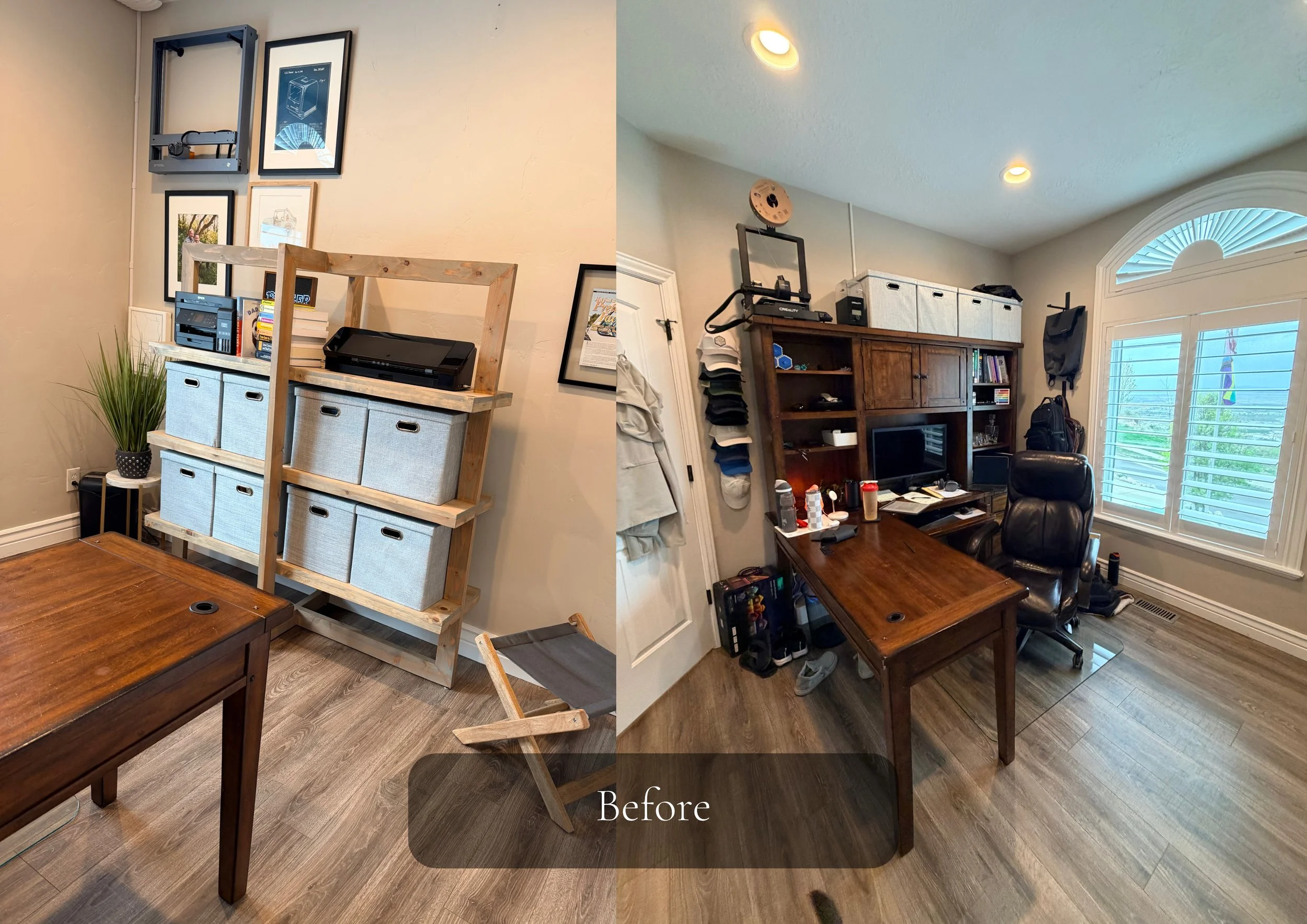 This office originally worked—but it felt busy. Open storage, visible clutter, and a desk pushed against the wall left the space without a clear focal point. It was functional, but not especially calm. The redesign focused on simplifying and giving the room structure.