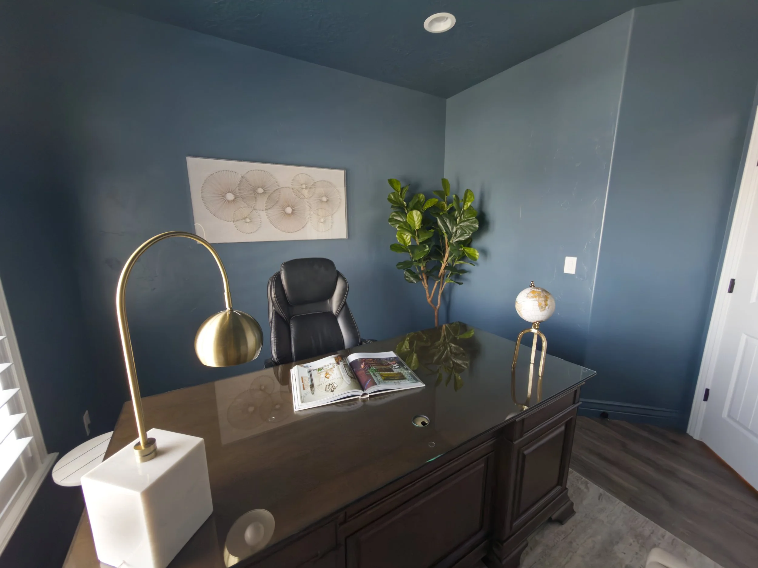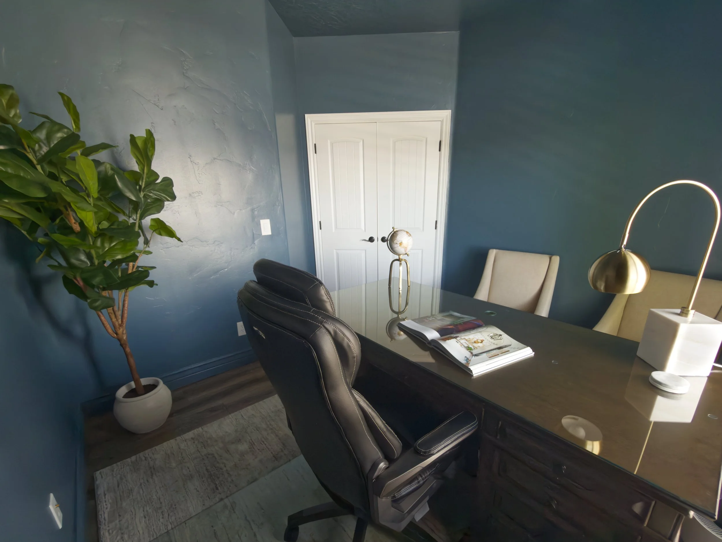 A new executive-style desk now anchors the space, pulled forward to create presence and better flow. Built-in storage keeps everything contained, allowing the room to feel more composed day to day. Two chairs in front soften the layout and make the space feel more welcoming.
